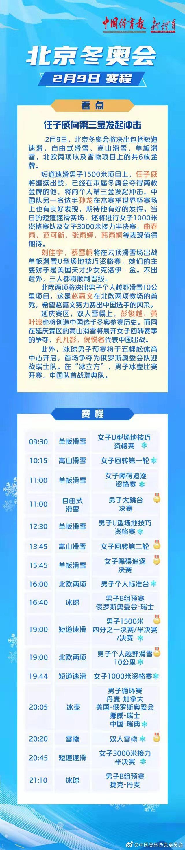 2月9日,北京冬奥会将决出包括短道速滑、自由式滑雪、高山滑雪、单板滑雪、北欧两项以及雪橇项目上的共6枚金牌。任子威将在短道速滑男子1500米项目中向个人第三金发起冲击,刘佳宇和蔡雪桐也将在单板滑雪U型场地技巧资格赛中登场亮相,祝他们取得好的成绩!加油!