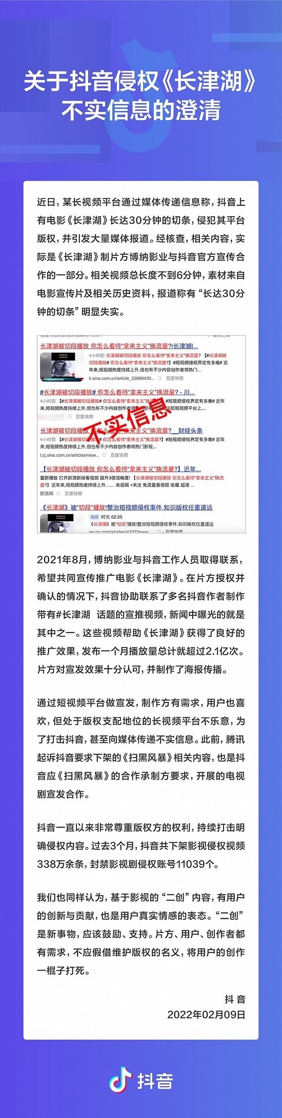 2月9日晚间,@抖音 发布关于抖音侵权《长津湖》不实信息的澄清: