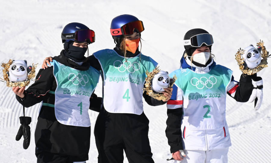 2月8日,夺得冠军的中国选手谷爱凌(中)、获得亚军的法国选手苔丝、获得季军的瑞士选手玛蒂尔德·格雷莫德在颁发纪念品仪式上。新华社记者熊琦摄
