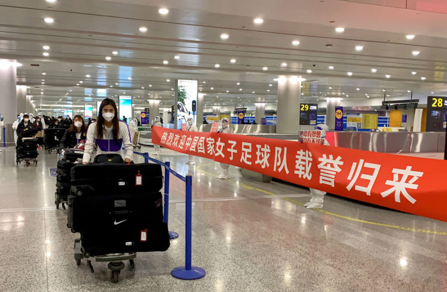 2月7日,中国女足队员抵达上海浦东国际机场。新华社发(中国东方航空供图)