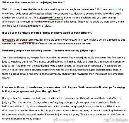 他表示在裁判们的回放角度,没有看到加拿大选手抓板失误,当他们认识到错误时,分数已经提交了。