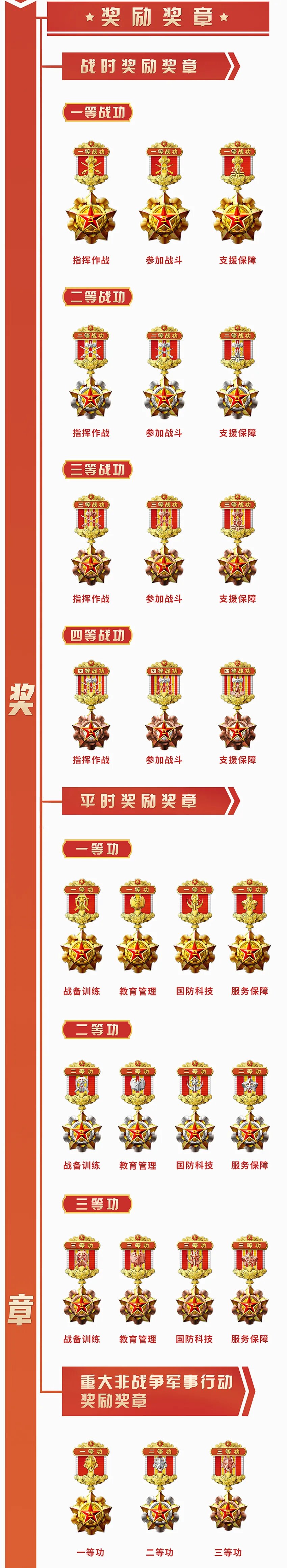 奖励奖章,由主章和副章组成,主章由军徽、团锦结、桂叶等元素构成,副章由荣誉带、奖励情形标识等元素构成,分为战时、平时、重大非战争军事行动奖励奖章。战时奖励奖章,分为一等战功、二等战功、三等战功、四等战功奖章,主章通径分别为60mm、50mm、47mm、45mm,区分指挥作战、参加战斗、支援保障3种情形。平时奖励奖章,分为一等功、二等功、三等功奖章,区分战备训练、教育管理、国防科技、服务保障4种情形。重大非战争军事行动奖励奖章,分为一等功、二等功、三等功奖章。平时、重大非战争军事行动一等功、二等功、三等功奖章主章通径分别为50mm、47mm、45mm。