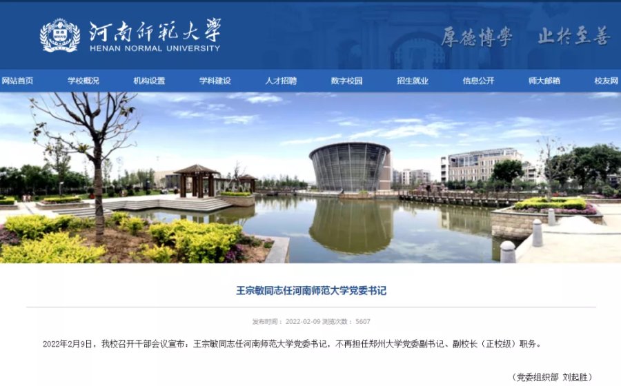 2月9日,河南师范大学召开干部会议宣布:王宗敏同志任河南师范大学党委书记,不再担任郑州大学党委副书记、副校长(正校级)职务。