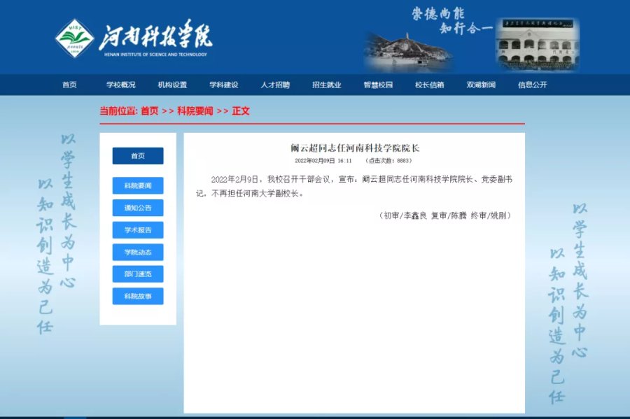 2月9日,河南科技学院召开干部会议,宣布:阚云超同志任河南科技学院院长、党委副书记,不再担任河南大学副校长。