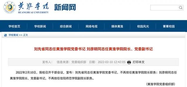 2022年2月10日,黄淮学院召开干部会议,宣布:刘先省同志任黄淮学院党委书记,不再担任黄淮学院院长职务;刘彦明同志任黄淮学院院长、党委副书记,不再担任信阳师范学院副院长职务。