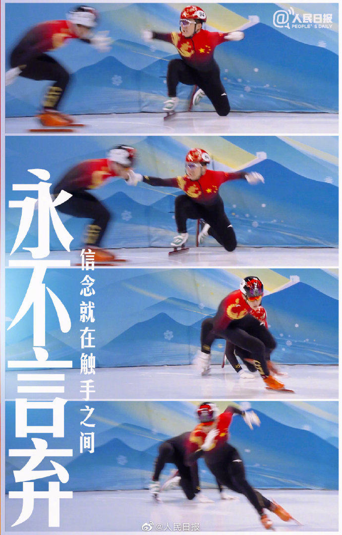 人民日报海报致敬短道速滑男团:永不言弃,信念就在触手之间
