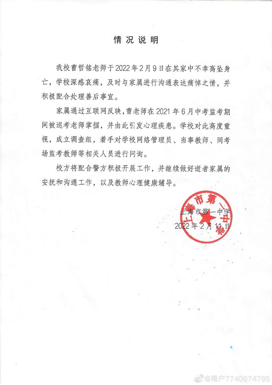 12日凌晨,上海市第一中学发布微博,就其校教师曹哲铭高坠身亡事件进行说明👇