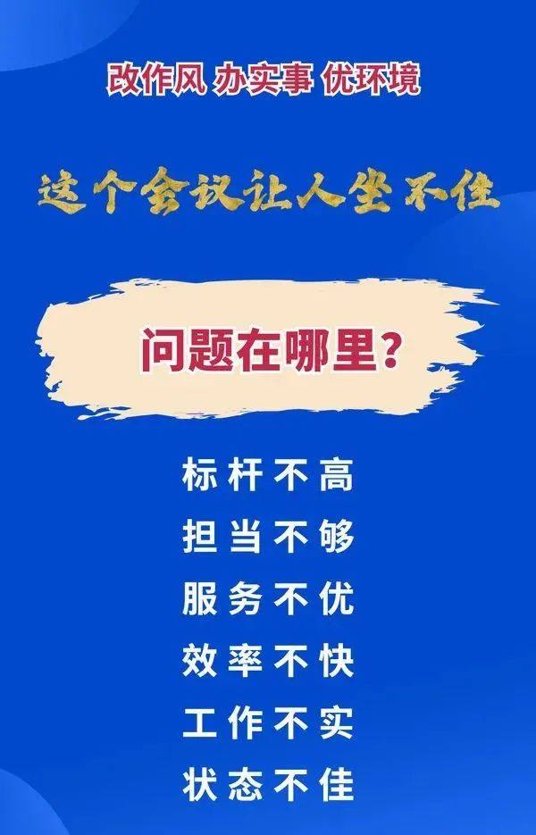 一是标杆不高。思想不够解放,小富即安、小进即满,习惯于触手可及的低端目标,满足于不上不下的中游位次,喜欢算人均、纵向比,不愿拉标杆、横向比,报喜不报忧、报功不报过,甚至甘于“躺平”。二是担当不够。有的只要不出事、宁可不做事,对矛盾问题回避绕行、视而不见;有的瞻前顾后、怕担责任,遇事层层请示汇报,总是说“上面没文件”“以前没干过”,说到底是不敢抓、不敢管;有的“新官不理旧账”,事不关己,高高挂起,习惯于“推绕拖”。三是服务不优。有的习惯当甩手掌柜,涉企服务质效不高;有的“门好进、脸好看”,但事还是难办,中梗阻、慢作为等现象依然存在;有的对企业承诺的事情不兑现、不履职,甚至吃拿卡要,损害营商环境。四是效率不快。有的干部不温不火、不紧不慢,企业和群众心急如焚,他却慢慢悠悠,习惯于按部就班、墨守成规;有的工作不问就石沉大海,一问就正在落实,永远都是进行时;有的工作推一下动一下,甚至推了也不动;有的项目审批环节多、程序繁、周期长,给企业和群众带来诸多不便。五是工作不实。有的装样子、摆架子、铺摊子,习惯以会议贯彻会议、以文件落实文件,表态多调门高、行动少落实差,把说了当做了、把做了当做成了;有的监督检查走过场,风险排查“一阵风”,执法不严“稻草人”;有的对群众合理诉求敷衍应付,出工不出力、甘当“太平官”。六是状态不佳。有的官气太重、暮气沉沉,缺少一股气、一股劲;有的守摊子、混日子,等文件政策、等组织安排,甚至等转岗、等退休,工作缺乏主动性和紧迫感。凌云说,改进无处不在,改进永无止境。我们要敢于正视问题、直面问题,以刀刃向内的勇气、自我革命的态度,切实解决人民群众和市场主体反映的突出问题,做到脑中有思路、眼里有问题、手上有招数、脚下有路子,以一流能力作风营造一流发展环境、创造一流工作业绩,确保各项工作落地落实、争先进位。二、目标是什么?