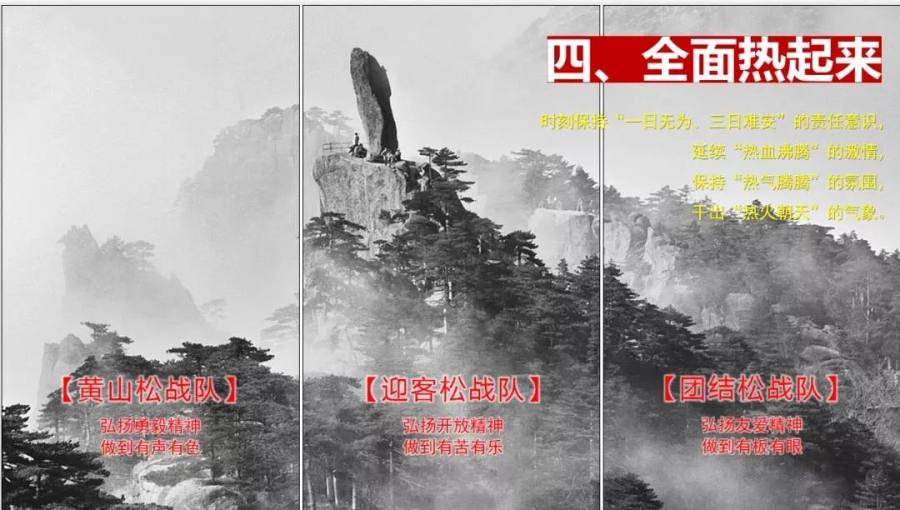 四要全面热起来。时刻保持“一日无为、三日难安”的责任意识,延续热血沸腾的激情,保持热气腾腾的氛围,干出热火朝天的气象。各级干部都要以黄山松的勇毅、迎客松的开放、团结松的友爱,提士气、抓落实、创标杆,奋力推动高质量发展。
