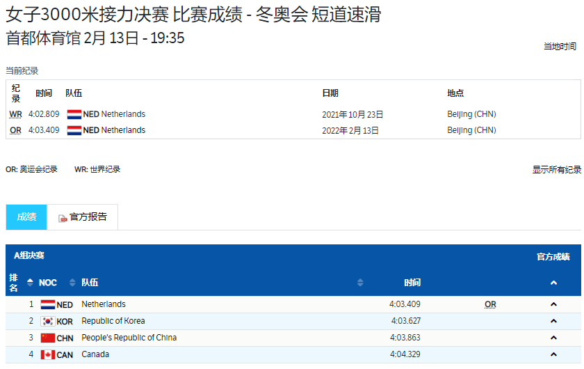 北京冬奥会短道速滑女子3000米接力决赛,中国队获得铜牌。荷兰队获得金牌,并打破奥运会纪录。