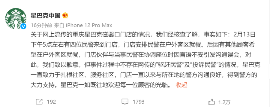 关于网上流传的重庆星巴克磁器口门店的情况,我们经核查了解,事实如下:2月13日下午5点左右有四位民警来到门店,门店安排民警在户外客区就餐。后因有其他顾客希望在户外客区就餐,门店伙伴与当事民警在协调座位时因言语不妥引发沟通误会,对此,我们致以歉意。但事件过程中不存在网传的“驱赶民警”及“投诉民警”的情况。星巴克一直致力于扎根社区、服务社区,门店一直以来与所在地的警方沟通良好,得到警方的大力支持。星巴克一如既往地欢迎每一位顾客的光临。