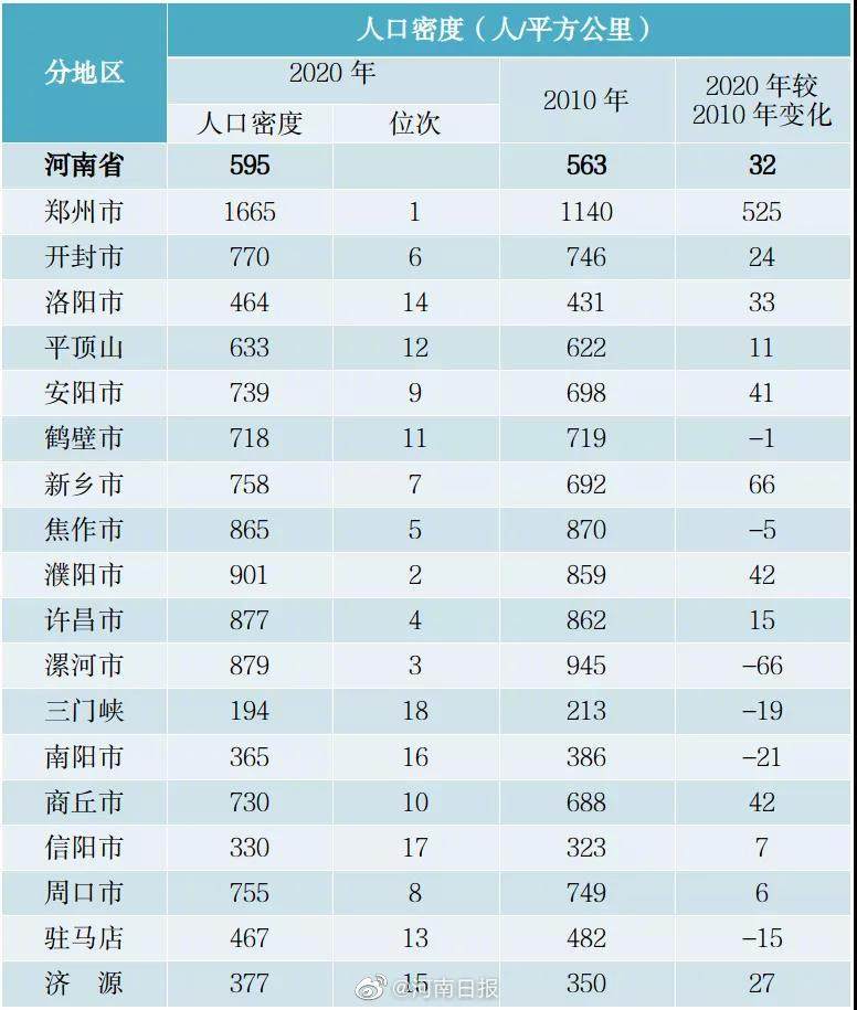 人口密度最高的是郑州市,为1665人/平方公里,是全省人口密度的2.8倍。(据河南日报)