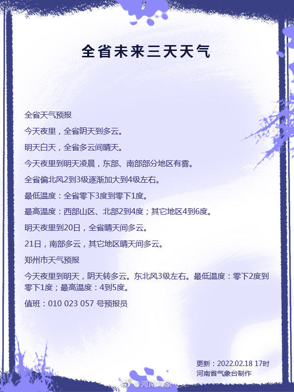另据郑州气象18日17时发布的天气预报,今天夜里到明天白天,郑州阴天转多云。