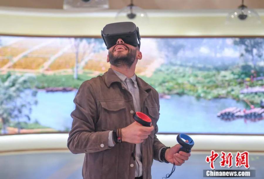 2021年5月,浙江杭州,外籍教师福迪尔在良渚古城遗址公园体验5G+VR项目。中新社记者 王刚 摄