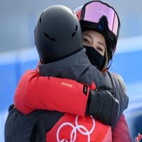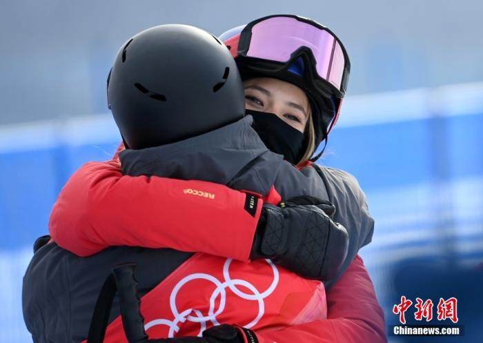 2月17日,北京2022年冬奥会自由式滑雪女子U型场地技巧资格赛在张家口云顶滑雪公园进行,图为赛后谷爱凌(右)拥抱鼓励其他选手。 中新社记者 翟羽佳 摄
