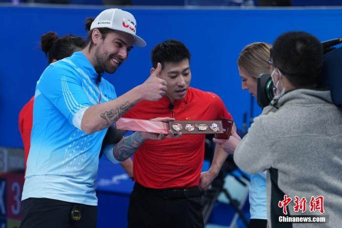2月5日,北京冬奥会冰壶混双循环赛中,由范苏圆、凌智组成的中国队5比7惜败美国组合。比赛结束后,范苏圆、凌智送给美国冰壶混双组合每人一盒4个冬奥徽章。凌智表示,4个冬奥徽章是不一样的,美国队非常喜欢这份礼物。中新社记者 崔楠 摄