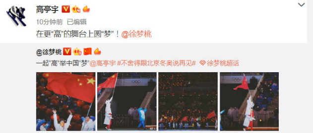对此,徐梦桃在社交平台发文回应:一起高举中国梦!高亭宇也转发回应:在更“高”的舞台上圆“梦”!