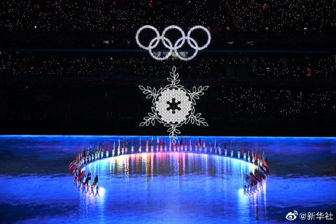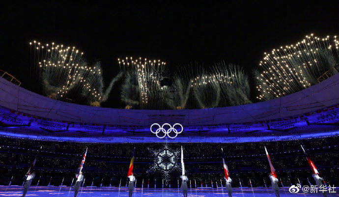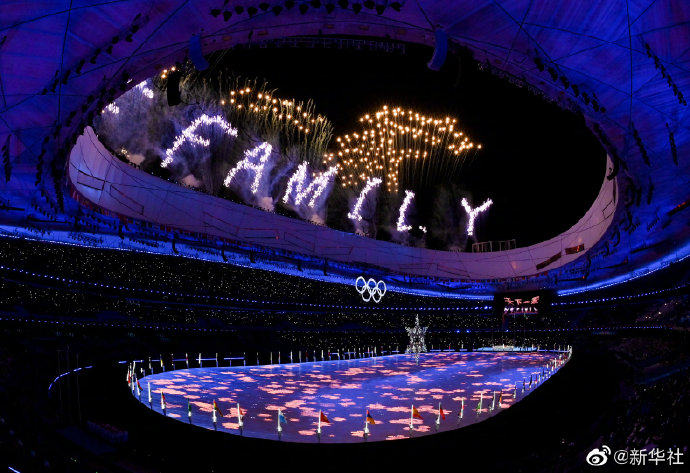 2月20日晚,北京冬奥正式闭幕。在纯洁空灵的《雪花》歌声中,主火炬“大雪花”缓缓落下,奥运之火渐渐熄灭。五环焰火再次升起,以此与2008年奥运会的同样五环烟花相呼应,体现双奥记忆。鸟巢上空用烟花打出“天下一家”和“ONE WORLD ONE FAMILY”中英文字样,象征“世界大同,天下一家”的主题表达和“更团结”的奥林匹克精神,为本届冬奥会画上一个成功圆满的句号。