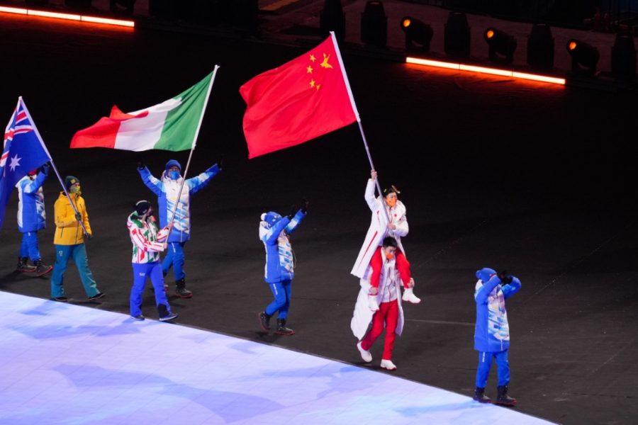 运动员入场环节,徐梦桃坐在高亭宇的肩膀上,高举五星红旗进场。