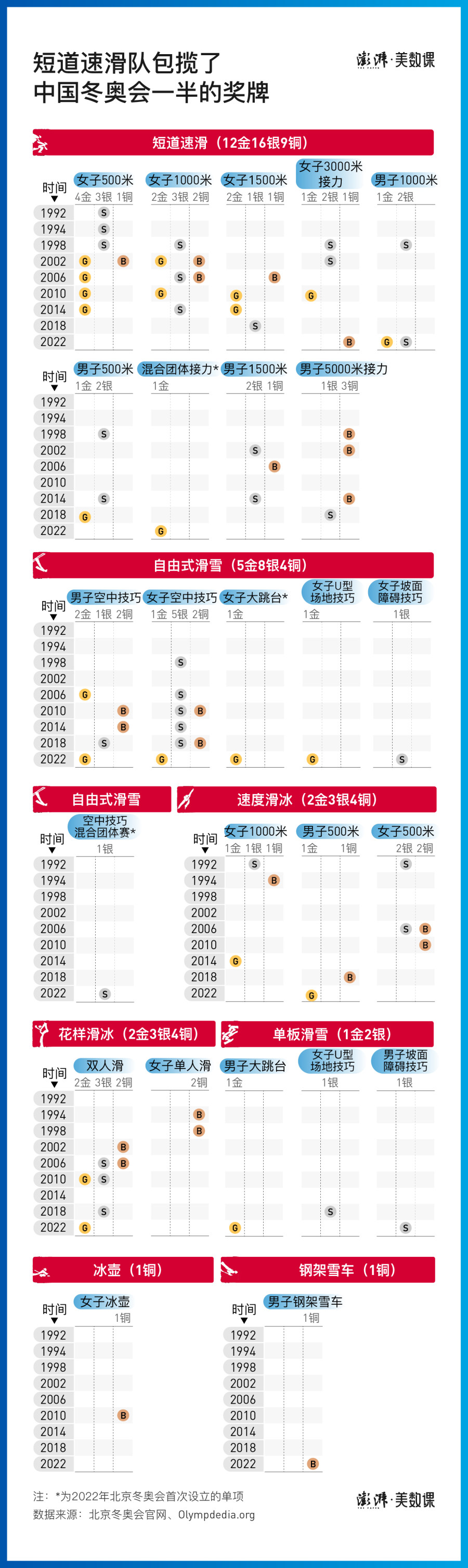以2金为起点,中国在此后的冬奥会上不断寻求突破。2006年都灵奥运会,中国收获2金4银5铜,奖牌总数首次超过10枚。2010年温哥华冬奥会,中国创纪录夺得5枚金牌,首次在一届冬奥会上位列奖牌榜前十。此后的2014年、2018年两届冬奥会,中国虽然未在奖牌榜上取得新的突破,但在守住短道速滑、自由式滑雪等传统强项夺牌点的同时,不断在分项成绩上取得突破。