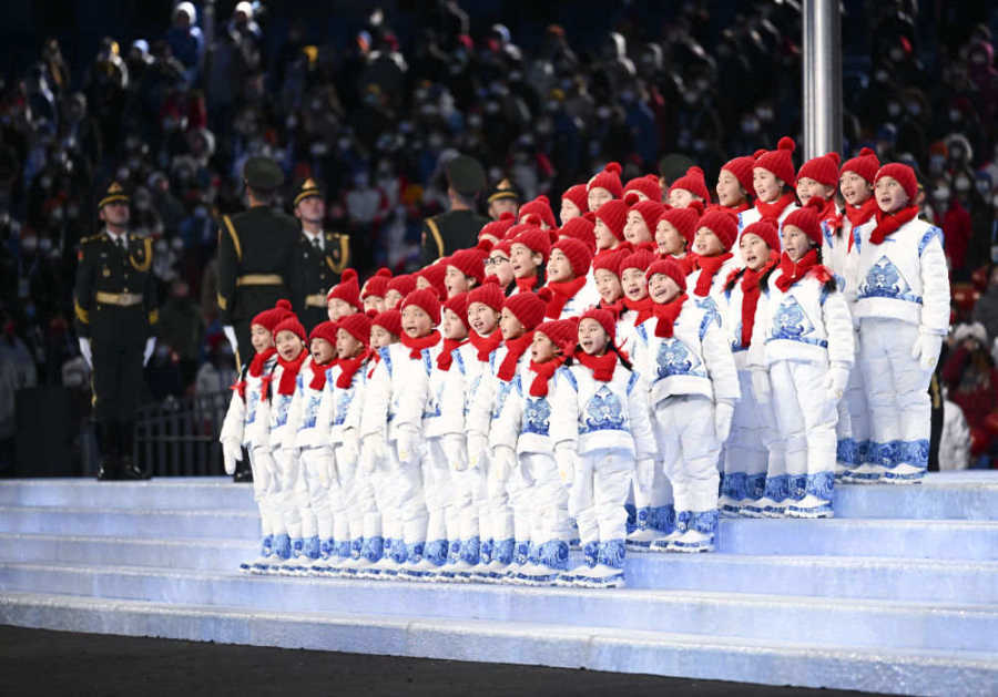 2月20日晚,北京第二十四届冬季奥林匹克运动会闭幕式在国家体育场举行。这是孩子们演唱奥林匹克会歌。