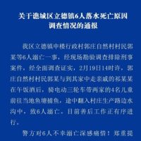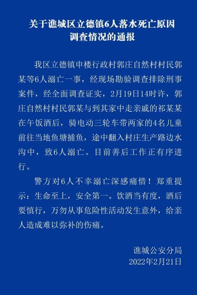 我区立德镇申楼行政村郭庄自然村村民郭某等6人溺亡一事,经现场勘验调查排除刑事案件,经全面调查证实,2月19日14时许,郭庄自然村村民郭某与到其家中走亲戚的祁某某在午饭酒后,骑电动三轮车带两家的4名儿童前往当地鱼塘捕鱼,途中翻入村庄生产路边水沟中,致6人溺亡。目前善后工作正有序进行。
