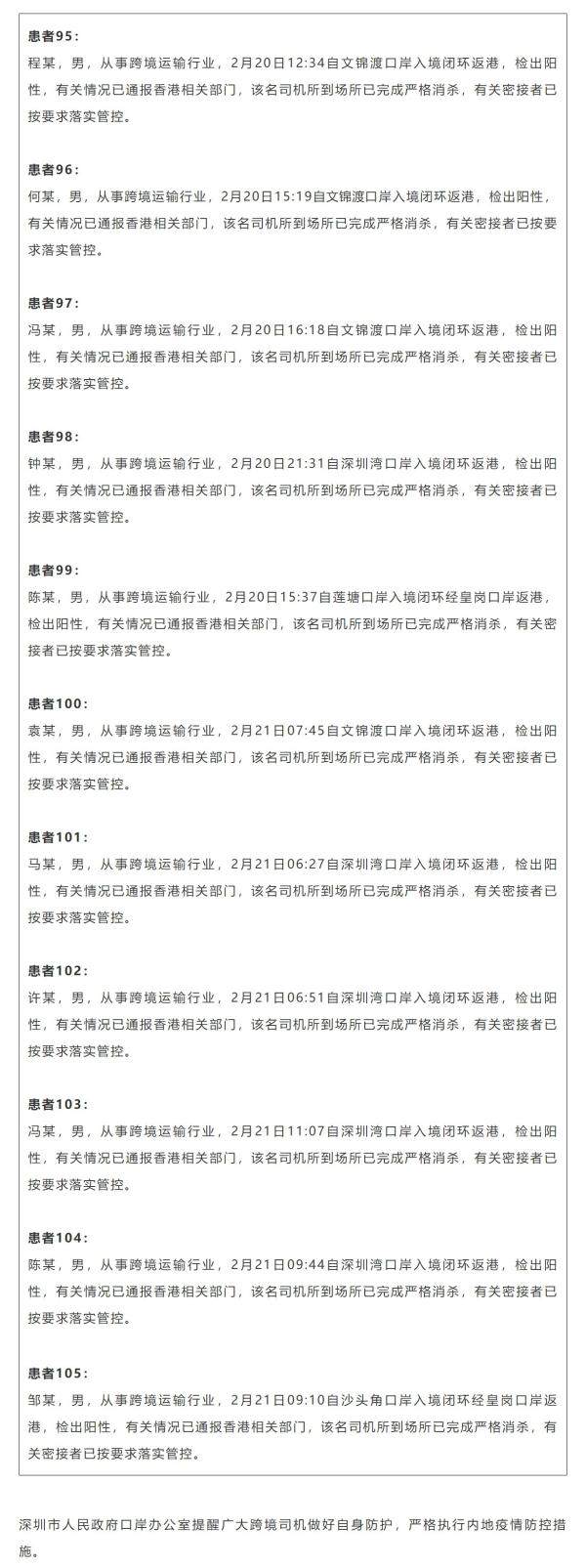 2月21日,深圳口岸检测出11名跨境货车司机核酸检测阳性。该11名患者为2月4日以来,深圳口岸检出的第95名至第105名跨境司机阳性病例。