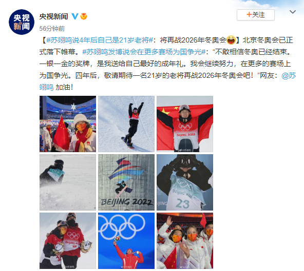 北京冬奥会已正式落下帷幕。苏翊鸣发博说会在更多赛场为国争光:“不敢相信冬奥已经结束。一银一金的奖牌,是我送给自己最好的成年礼。我会继续努力,在更多的赛场上为国争光。四年后,敬请期待一名21岁的老将再战2026年冬奥会吧!”