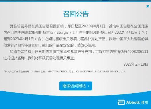 2月20日,中国海关总署官网发布了一则“雅培中国召回其销售的一款特医产品”的消息:经海关总署核查,涉事企业生产的特医产品Similac HMFortifi 喜康宝贝添特殊医学用途婴儿营养补充剂有对华出口记录,雅培中国已启动自主召回。