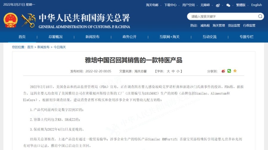 2月20日,中国海关总署官网发布消息称,经海关总署核查,上述产品没有通过一般贸易输华;涉事企业生产的特医产品Similac HMFortifi 喜康宝贝添特殊医学用途婴儿营养补充剂有对华出口记录,雅培中国已启动自主召回。