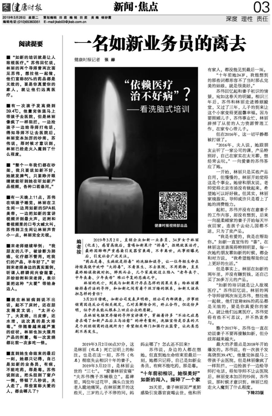 而根据此前健康时报《一名如新业务员的离去》报道,2019年,直销企业如新一业务员、34岁女子感冒高烧后,靠喝如新果汁“排毒”,拒绝就医治疗,最终因肺部严重感染引发器官衰竭,不幸离世的事件,“如新的培训就是让人敌视医疗。”当事人的家人曾经这样说道。