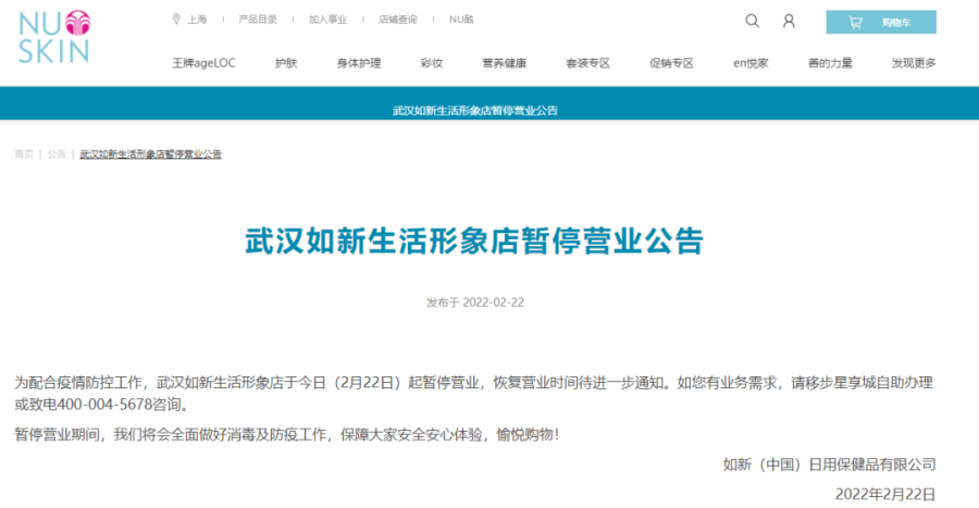 2月22日下午,记者浏览如新集团官网,短短2天时间,其发布了包括武汉、北京、呼和浩特等4地店铺暂停营业的公告。