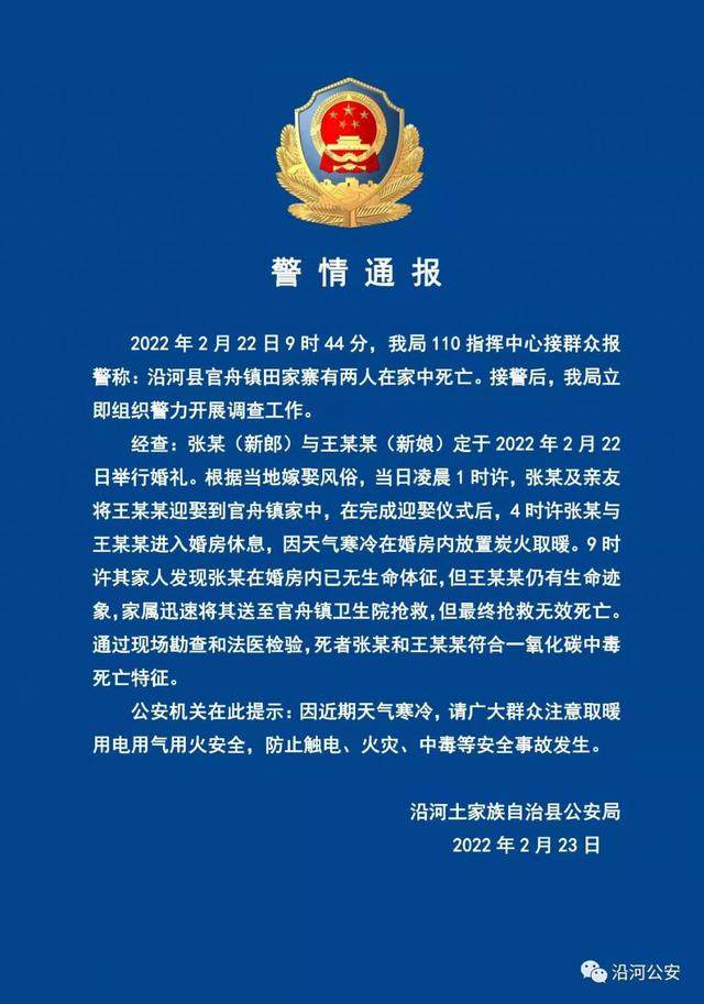2月22日,贵州省沿河县一对新婚夫妻在婚礼仪式当夜身亡。沿河警方发布警情通报称,死者张某和王某某在婚房内烧炭取暖,符合一氧化碳中毒死亡特征。