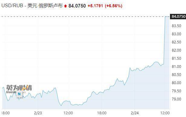 在外汇市场上,美元兑俄罗斯卢布涨幅持续扩大至6%,报84.1卢布。欧元兑卢布自2014年12月以来首次突破95。最新消息显示,因触发交易限制,莫斯科证券交易所(MOEX)的卢布、股票交易暂停。