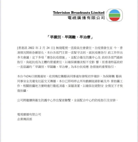 据港媒,TVB宣布因受疫情影响所有剧组将全面停工,其中包括《隐门》《法言人》《回归》《曙光》等剧组。发布的公告中表示目前“已即时停止所有戏剧组录影厂及外景拍摄工作,相关拍摄地方实时进行彻底消毒、深层清洁,以确保在绝对安全情况下再恢复拍摄”。