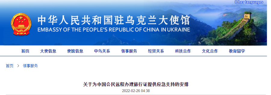 中国驻乌克兰大使馆:启动为中国公民远程办理旅行证的应急支持