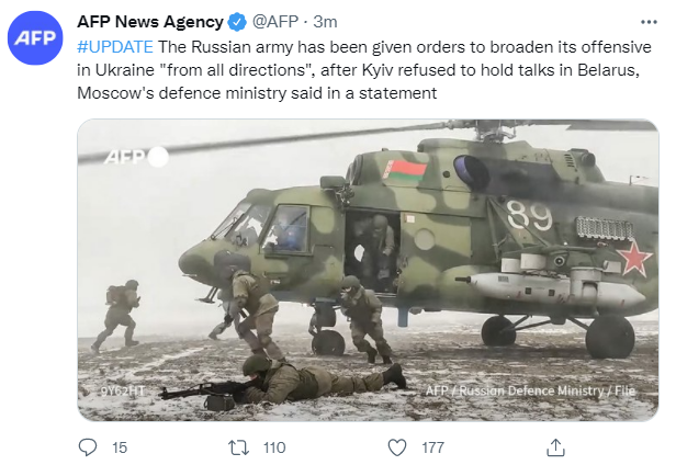 法新社刚刚消息,俄罗斯国防部26日在一份声明中表示,在基辅拒绝(与俄罗斯)在白俄罗斯举行谈判后,俄军已接到命令,“从各个方向”推进对乌克兰的攻势。