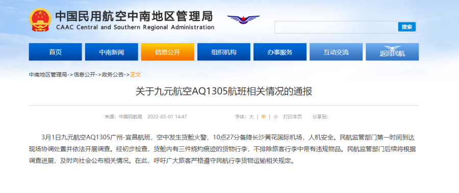 3月1日九元航空AQ1305广州-宜昌航班,空中发生货舱火警,10点27分备降长沙黄花国际机场,人机安全。民航监管部门第一时间到达现场协调处置并依法开展调查。经初步检查,货舱内有三件烧灼痕迹的货物行李,不排除旅客行李中带有违规物品。民航监管部门后续将根据调查进展,及时向社会公布相关情况。在此,呼吁广大旅客严格遵守民航行李货物运输相关规定。