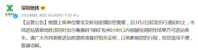 据@深圳地铁消息,根据上级单位要求及新冠疫情防控需要,自3月2日起至另行通知时止,市民进站搭乘地铁须同时出示粤康码“绿码”和48小时以内核酸检测阴性结果方可进站乘车。