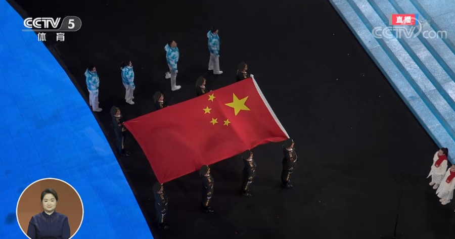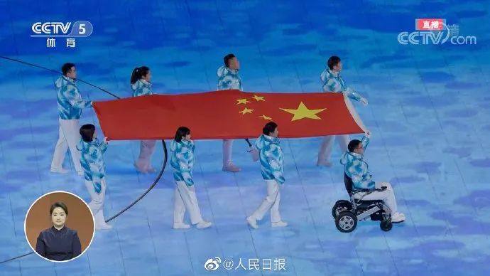中国冬残奥代表团入场,鸟巢出现巨幅五星红旗,再次响起《歌唱祖国》!