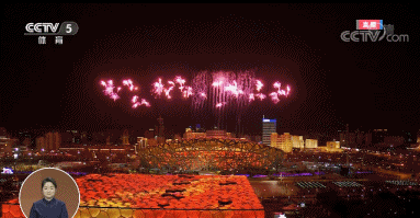 鸟巢上空绽放紫色雪花,开幕焰火由特效焰火构成的紫色雪花,唯美的绽放在夜空中。