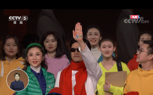 一位盲人的手掌上,映出了一枚国际残奥委会标志。这枚标志,经过手手相传,印在了每一个人的手掌中。这是历届残奥会与冬残奥会“国际残奥委会标志展示”环节中,呈现出的最小的标志。