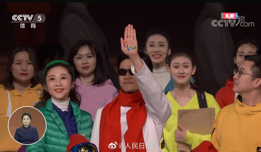 一位盲人的手掌上,映出了一枚国际残奥委会标志。这枚标志,经过手手相传,印在了每一个人的手掌中。这是历届残奥会与冬残奥会“国际残奥委会标志展示”环节中,呈现出的最小的标志。