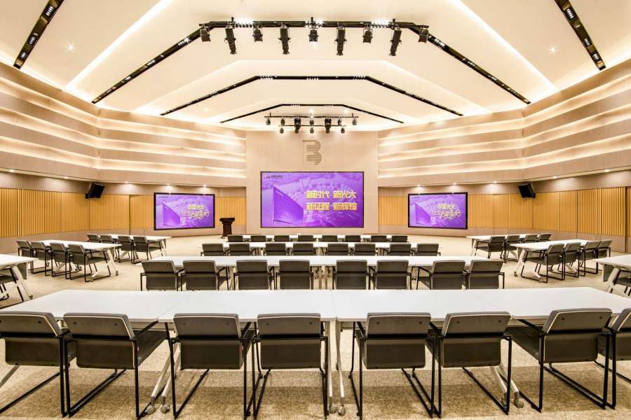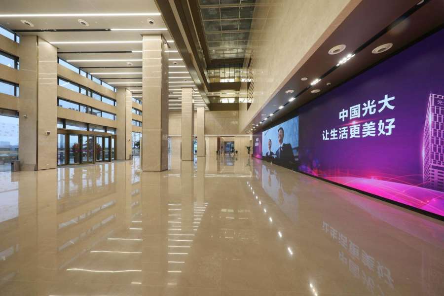从郑州光大中心北门进入大堂,看着挑空高达18米的中厅,让人更加深刻感受到气宇轩昂的魅力。而镶嵌于楼体中央的迭级造型,如同层层高升的天梯。大堂上下两层的构造呼应建筑外立面乾坤之意,而正对主入口的LED大屏幕面积达104㎡,正播放着光大银行的宣传片。