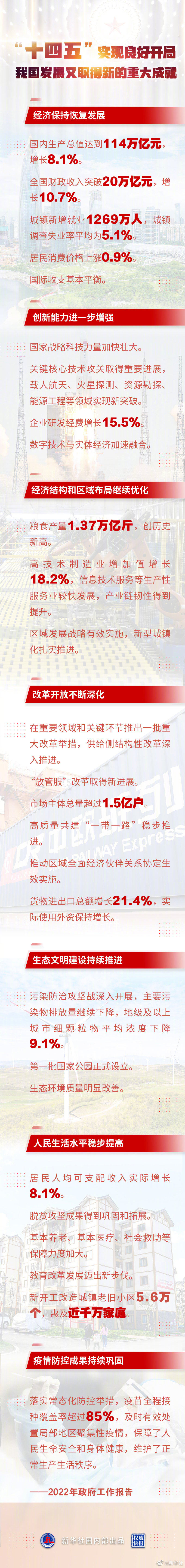 5日提请十三届全国人大五次会议审议的政府工作报告提出,一年来,面对复杂严峻的国内外形势和诸多风险挑战,全国上下共同努力,统筹疫情防控和经济社会发展,全年主要目标任务较好完成,“十四五”实现良好开局,我国发展又取得新的重大成就。