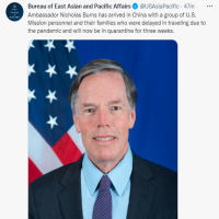 新任美国驻华大使尼古拉斯·伯恩斯已抵达中国,将隔离3周