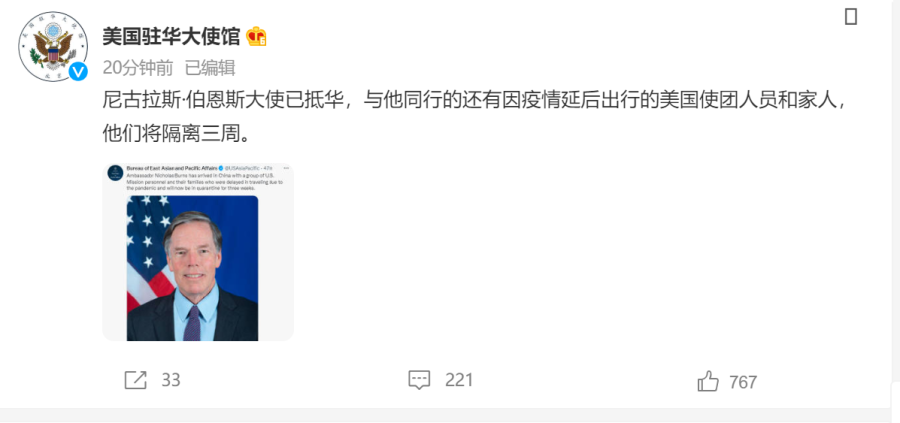 5日,据美国驻华大使馆微博消息:尼古拉斯·伯恩斯大使已抵华,与他同行的还有因疫情延后出行的美国使团人员和家人,他们将隔离三周。