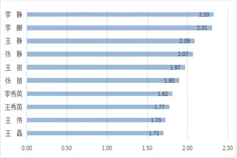 河南省第七次全国人口普查结果显示,重名重姓数量最多的10个姓名分别是“李静”、“李娜”、“王静”、“张静”、“王丽”、“张丽”、“李秀英”、“王秀英”、“王伟”、“王磊”。重名重姓率排名第一的“李静”共有2.33万人,第二名的“李娜”与第一名相差200多人,第三名的“王静”共有2.09万人。排名前十的重名重姓中,最多的是2字姓名,共有8个。排名前六的都是2字姓名。
