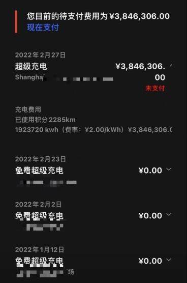 3月6日,上述网友晒出一张截图显示,其今年最近一次使用特斯拉的超级充电桩是在2月27日,花费为384.63万元,在此之前,均为免费超级充电。