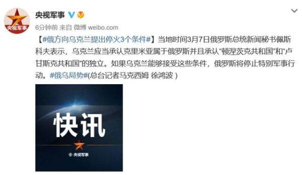 当地时间3月7日俄罗斯总统新闻秘书佩斯科夫表示,乌克兰应当承认克里米亚属于俄罗斯并且承认“顿涅茨克共和国”和“卢甘斯克共和国”的独立。如果乌克兰能够接受这些条件,俄罗斯将停止特别军事行动。